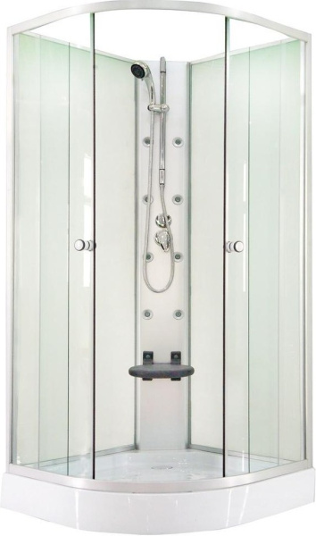 | • 8 Гидромассажных фарсунак в колонке • задняя панель - 4 мм безопасное стекло, матовое • дверь - 4 мм безопасное стекло • душевая штанга • профиль - хром, мат • один смеситель и выключатель • ручной душ • сиденье |