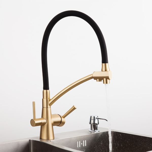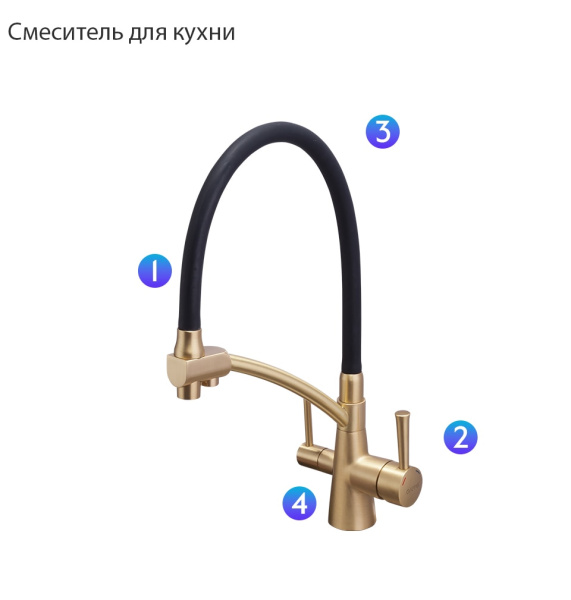 Назначение Для кухни;Для кухни под фильтр Тип смесителя Однорычажный Покрытие корпуса Бронза/Медь/Золото Способ монтажа Вертикальный Душевая лейка/выдвижной излив Да Излив Высокий |