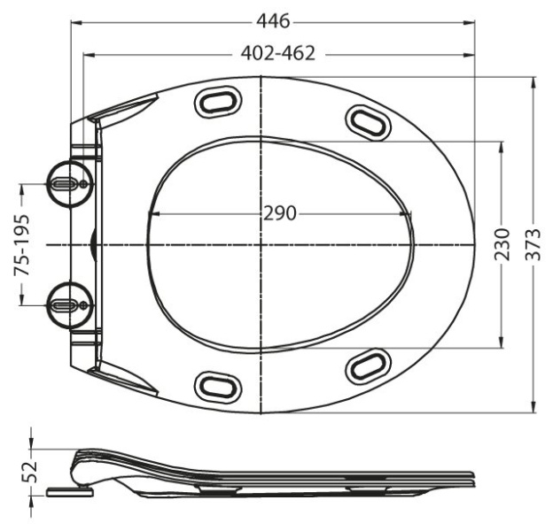 | Габаритные размеры: 446x373x52 • Жесткая крышка-сиденье из дюропласта, быстросъёмная, с механизмом Soft Close |