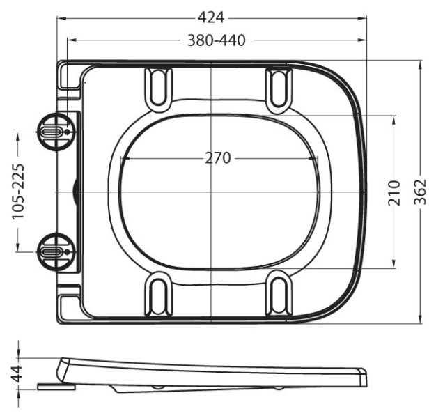 | Габаритные размеры: 424x362x44 • Жесткая крышка-сиденье из дюропласта с механизмом Soft Close |