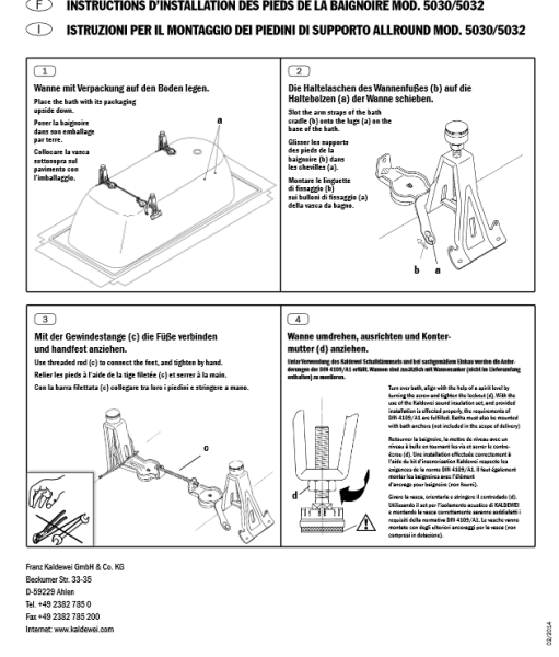 Ножки для стальной ванны Kaldewei 5030 (Комплект) , регулируемые. Высота ножек 15-20 см. Количество опор :4 Артикул:581470000000 Подходят к моделям стальных ванн Kaldewei Saniform, Cayono. |