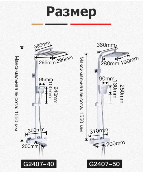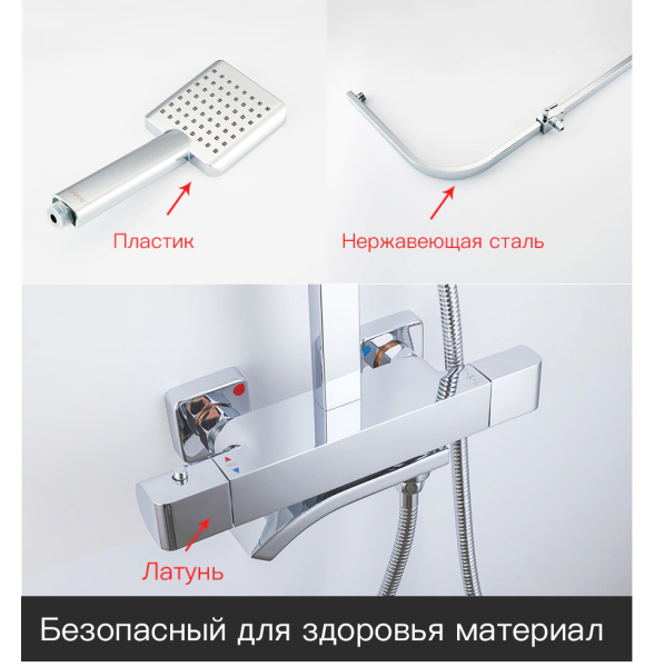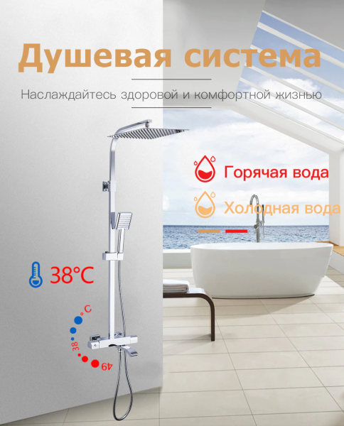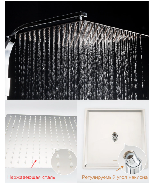 термостатический картридж Guoren; тропический душ (300х300 мм); душевой шланг; шланг вращается на 360 градусов; держатель для лейки. Комплектация: Душевая система Инструкция Гарантийный талон |