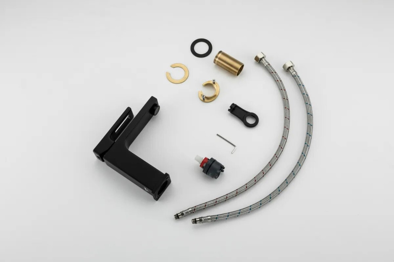 Изготовлен из латуни и окрашен в черный цвет. Не поржавеет, а краска не слезет. Крепится к раковине на гайку. К выходам труб подключается гибкими подводками. Смешивает воду керамическим картриджем.