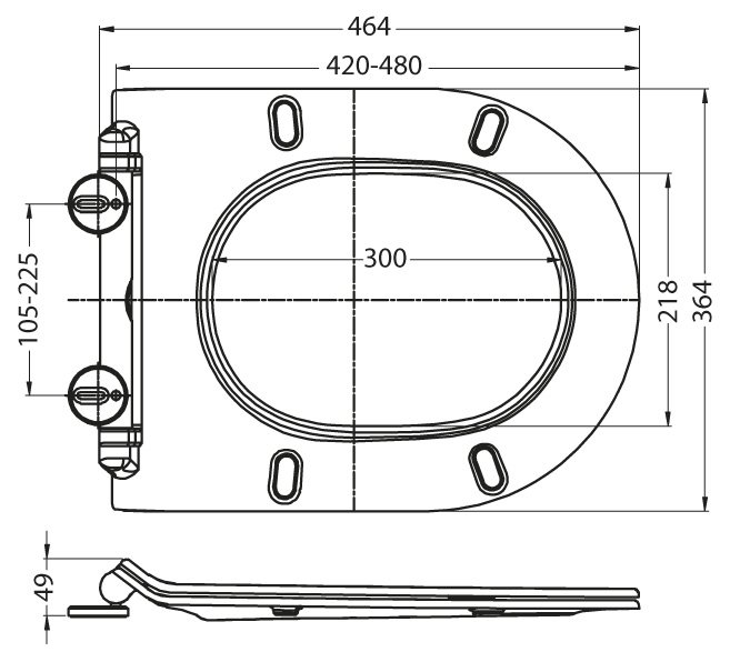 | Габаритные размеры: 464x364x49 • Жесткая крышка-сиденье из дюропласта, быстросъёмная, ультратонкая SLIM, с механизмом Soft Close |